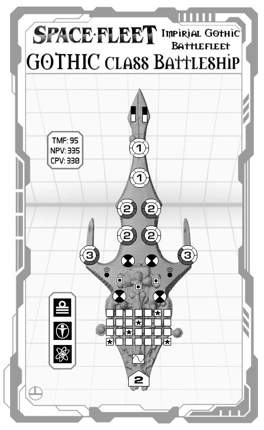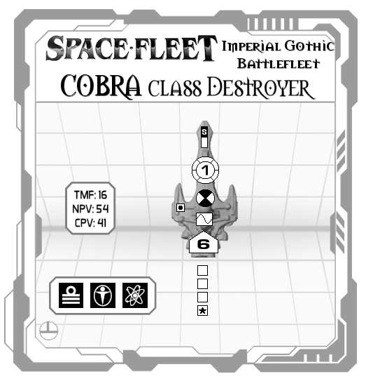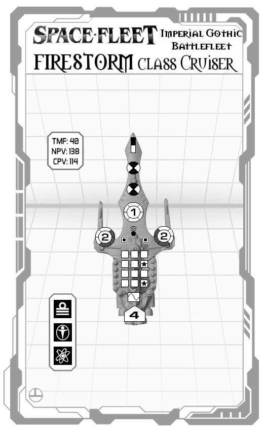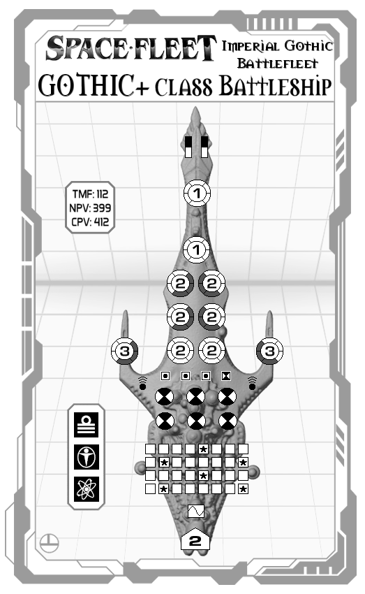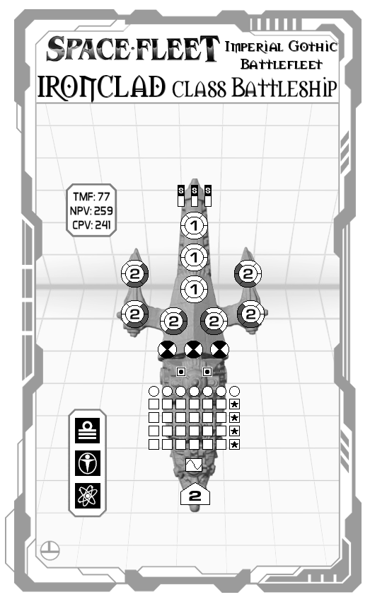 Mass 77 Cost 259/241 Strong Hull 28 (7/7/7/7) Armour 7 points Thrust 2 FTL 2 Fire Controls 3 PDSs 3 Class 1 Beam Batteries 6 Class 2 Beam Batteries (3xF/FP/AP, 3xF/FS/AS) 3 Short Range Pulse Torpedoes (3xF)